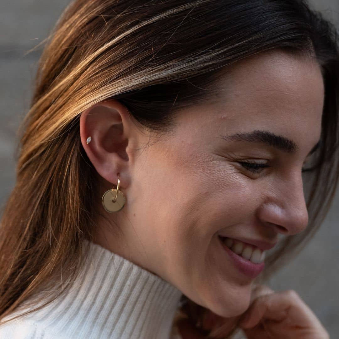 Boucle d’oreille small doré à l’or fin. Un cercle de lumière satiné à la main, poli en bordure et en son centre.
