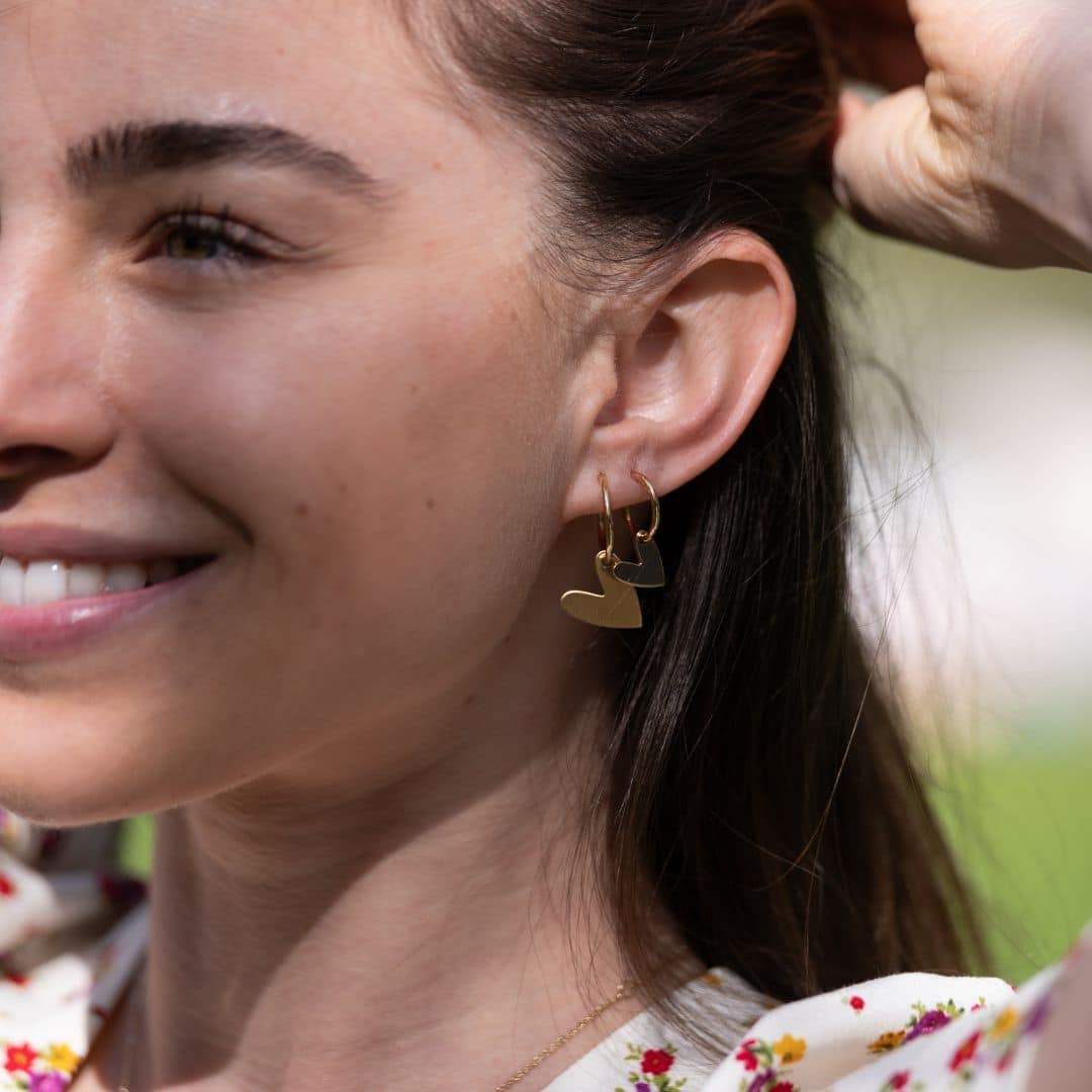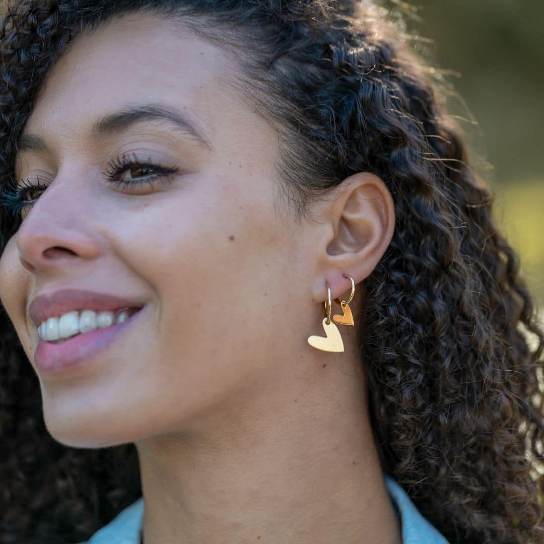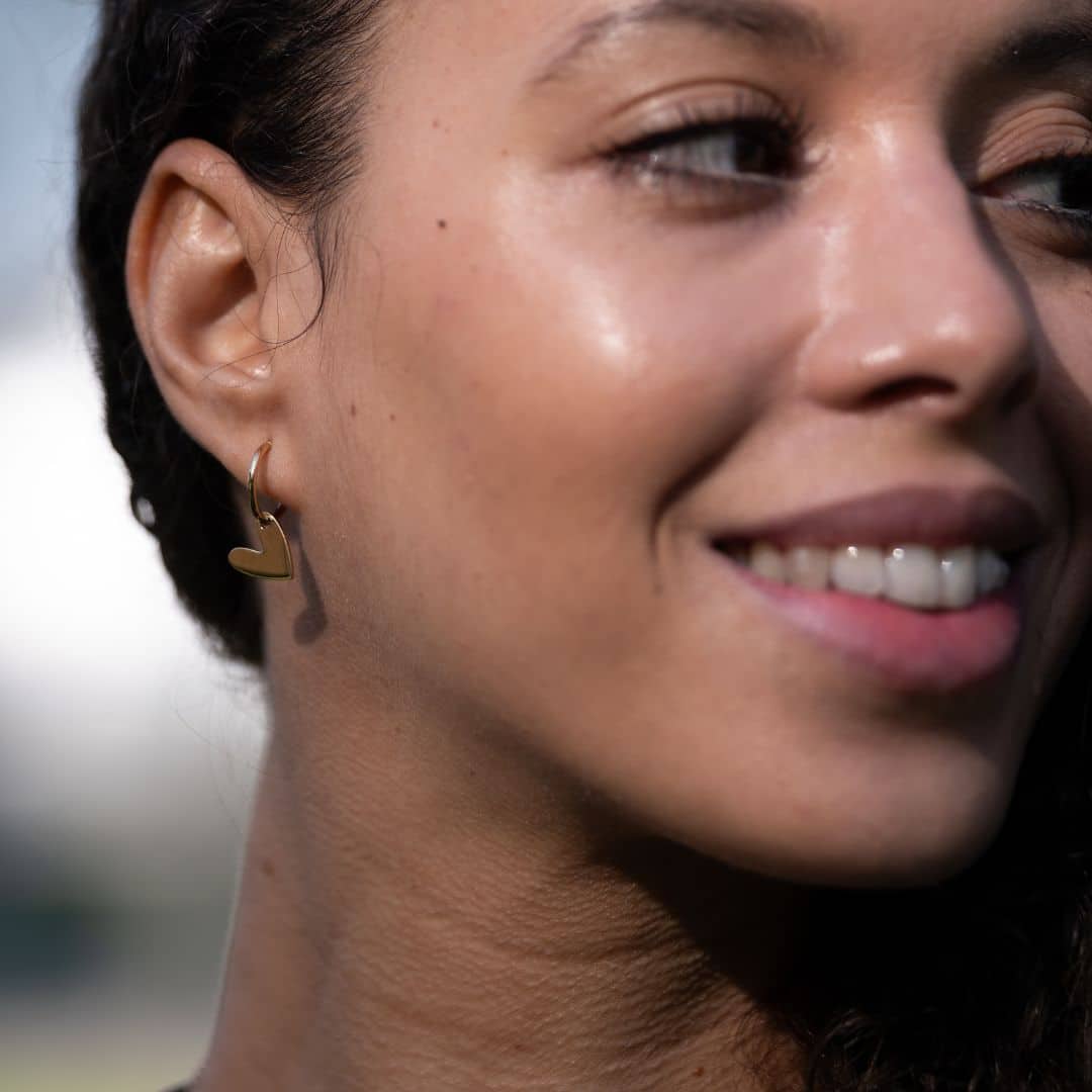 Le cœur poli suspendu à sa créole, symbole du lien subtil entre fragilité et force, reflet de notre propre coeur, centre névralgique de notre vie.