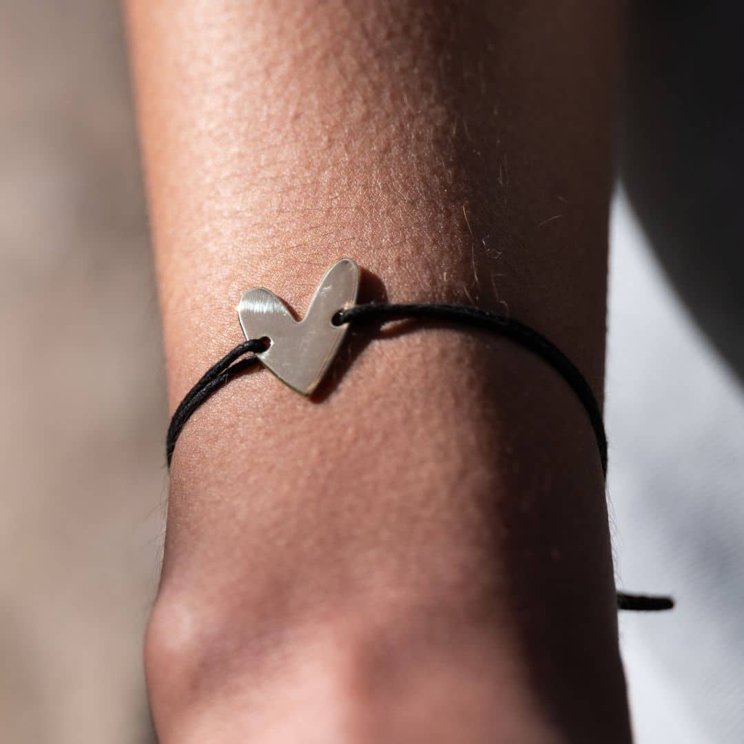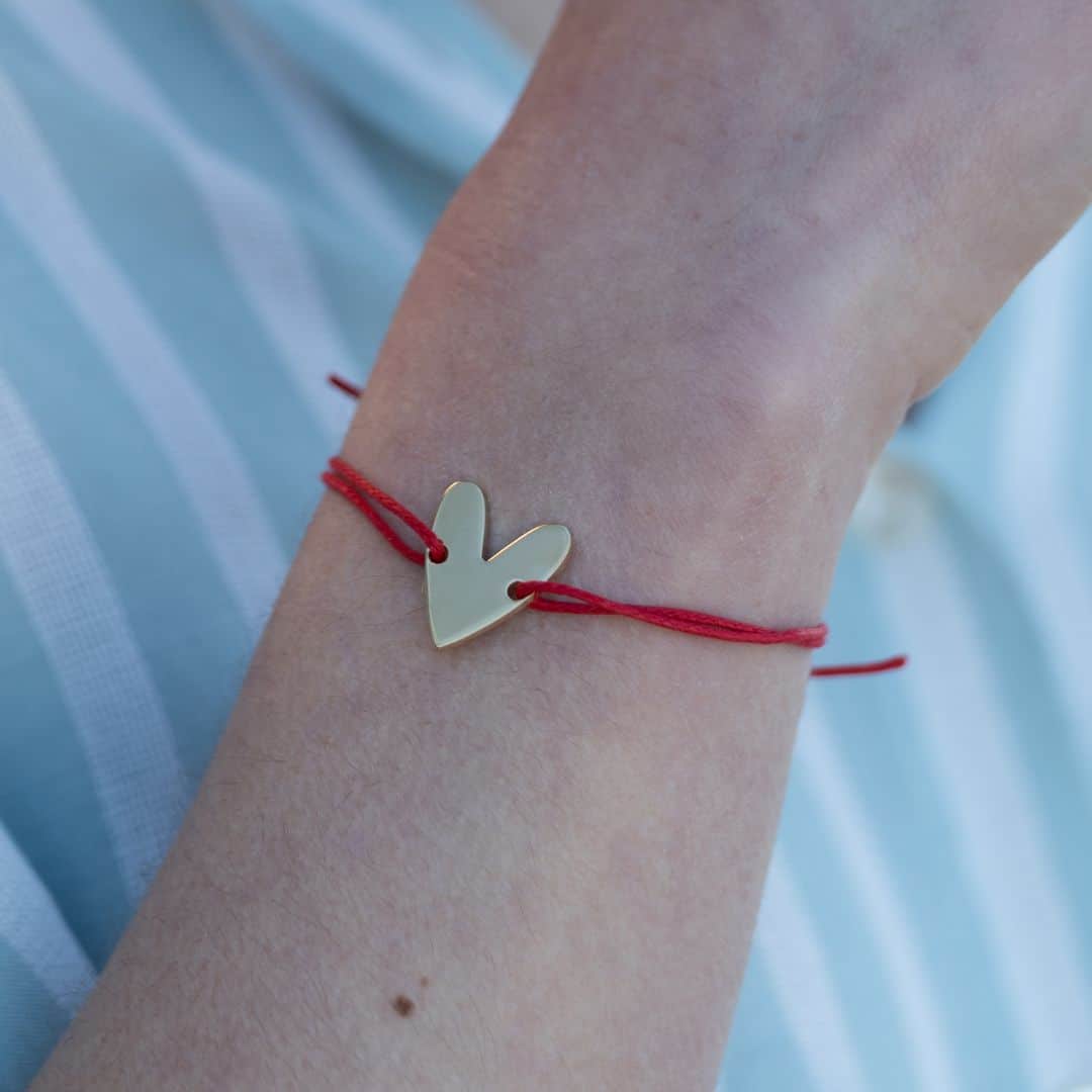 Bracelet doré, ajustable au poignet avec son cordon 100% coton et son coeur poli.