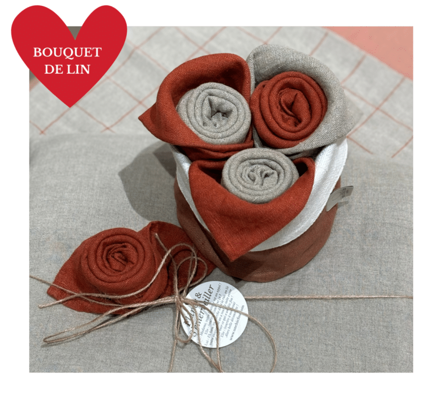 Pour ceux qui recherchent une idée originale, découvrez nos magnifiques bouquets de lin. Ces compositions raffinées comprennent 6 serviettes et 1 corbeille de table en lin éco-responsable.