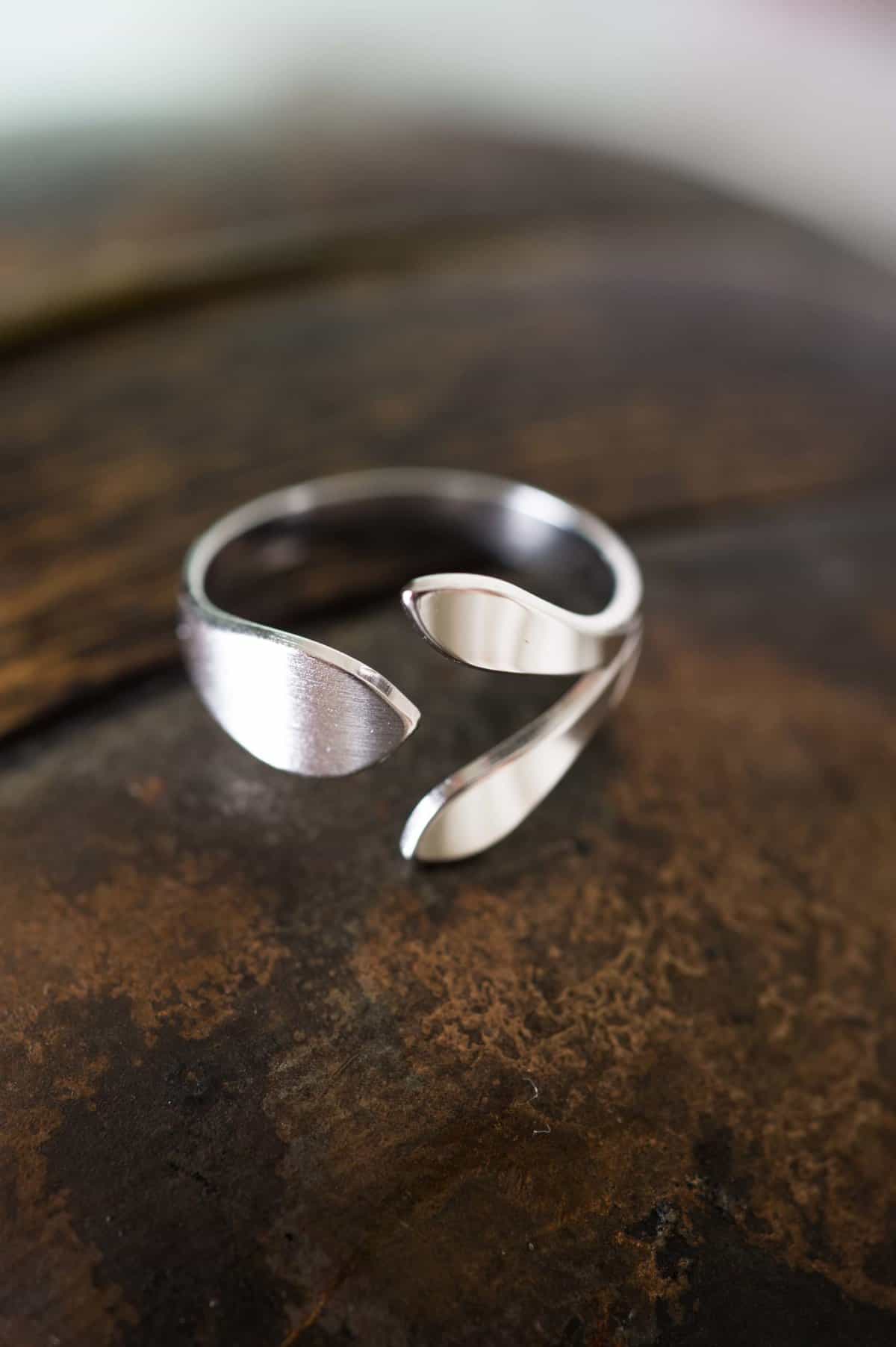 - Bague ouverte et ajustable. Taille 52 – 54.