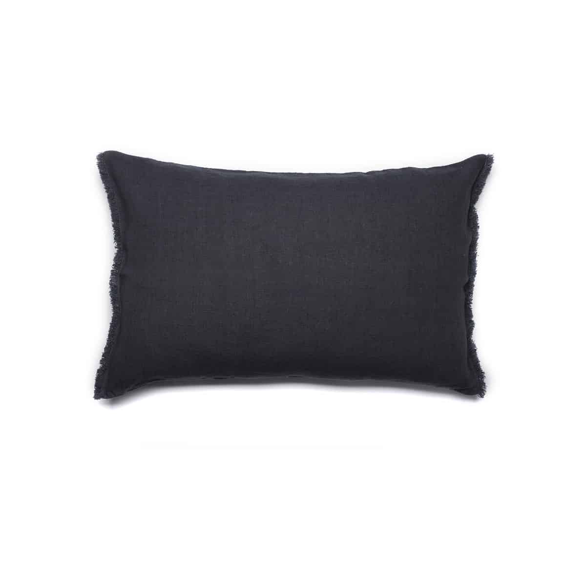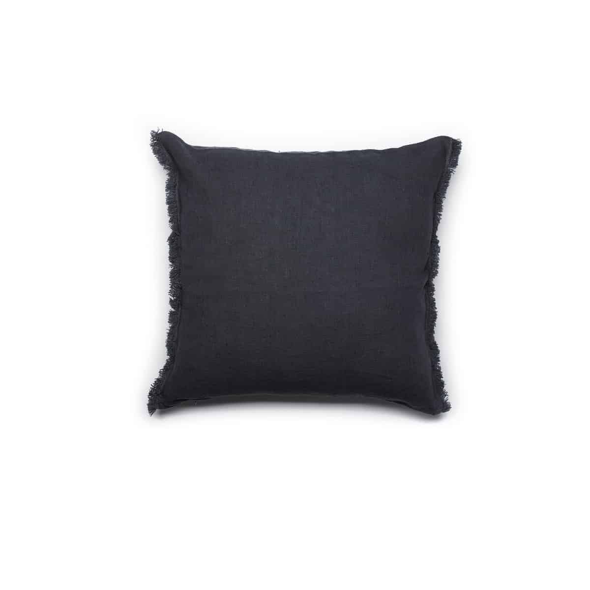 Housse de coussin Ardoise 100% lin, douce et élégante, avec des franges entièrement réalisées à la main. Une couleur Ardoise, un gris foncé intense, sobre, chic et élégant pour habiller votre intérieur d’un chic fou.