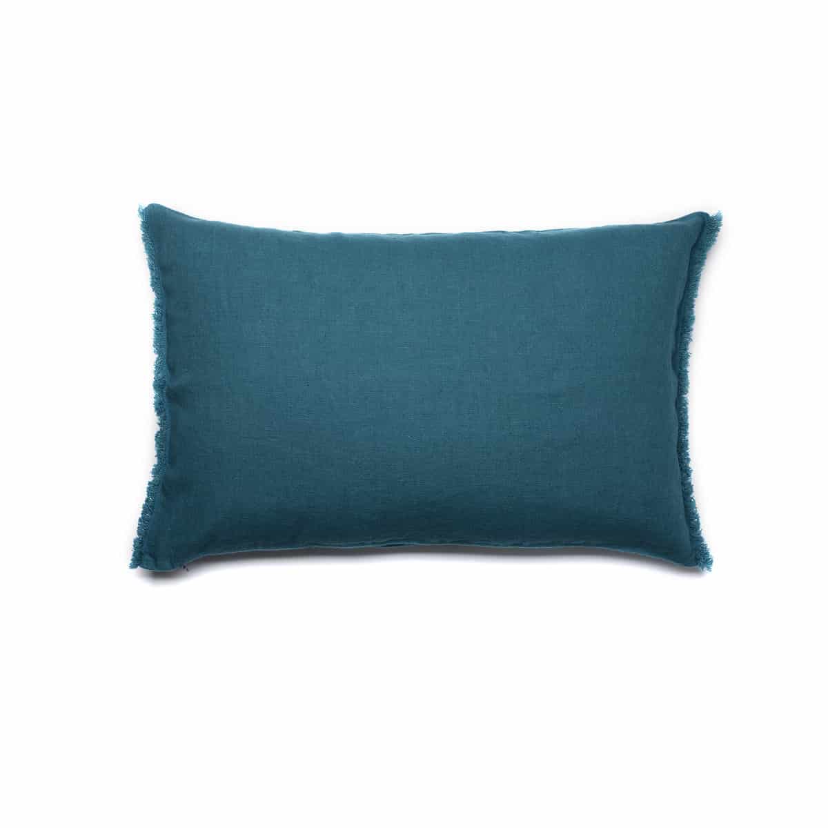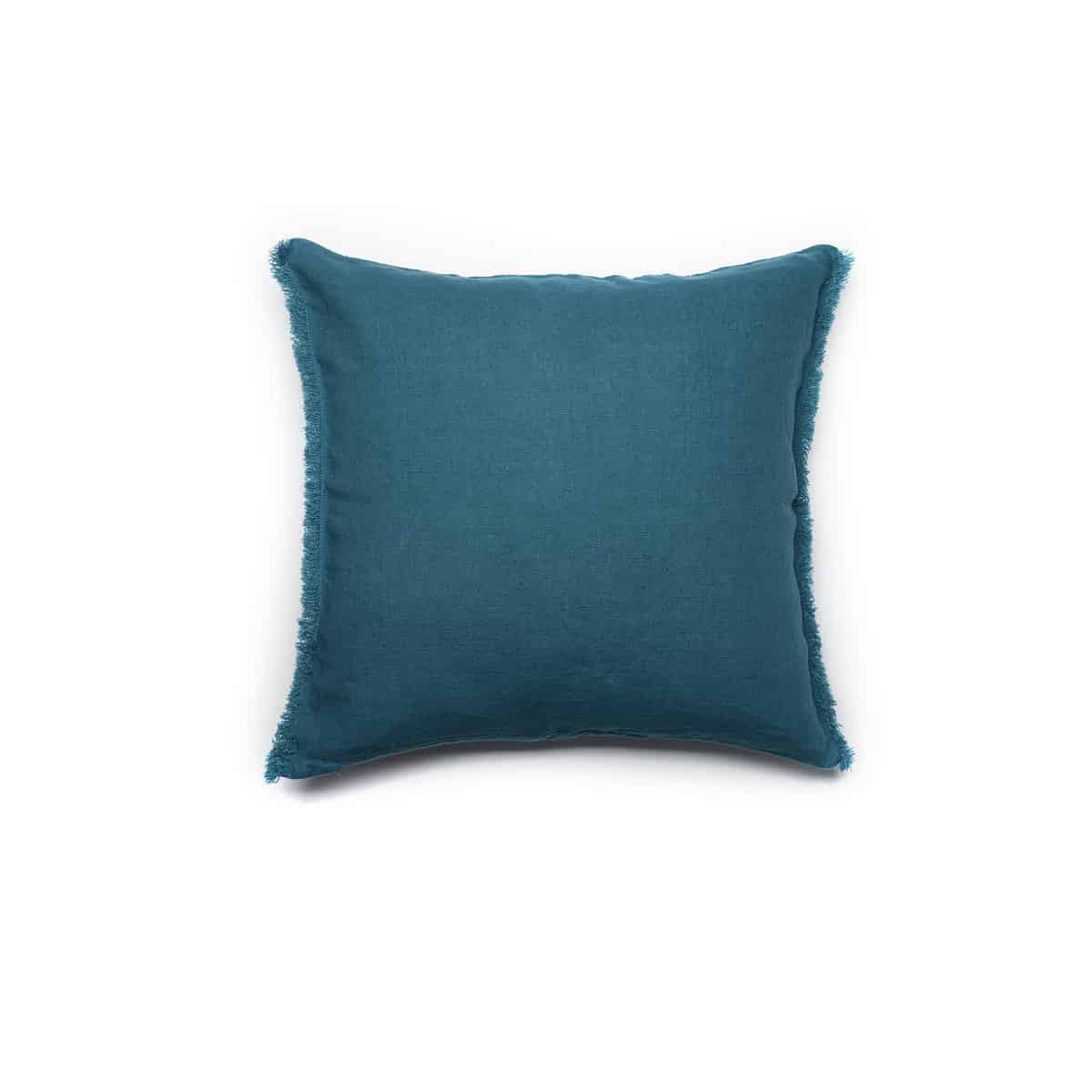 Housse de coussin Canard 100% lin, douce et élégante, avec des franges entièrement réalisées à la main. Une couleur Canard, bleu-vert intense et lumineux, original et élégant pour habiller vos intérieurs tout en finesse.