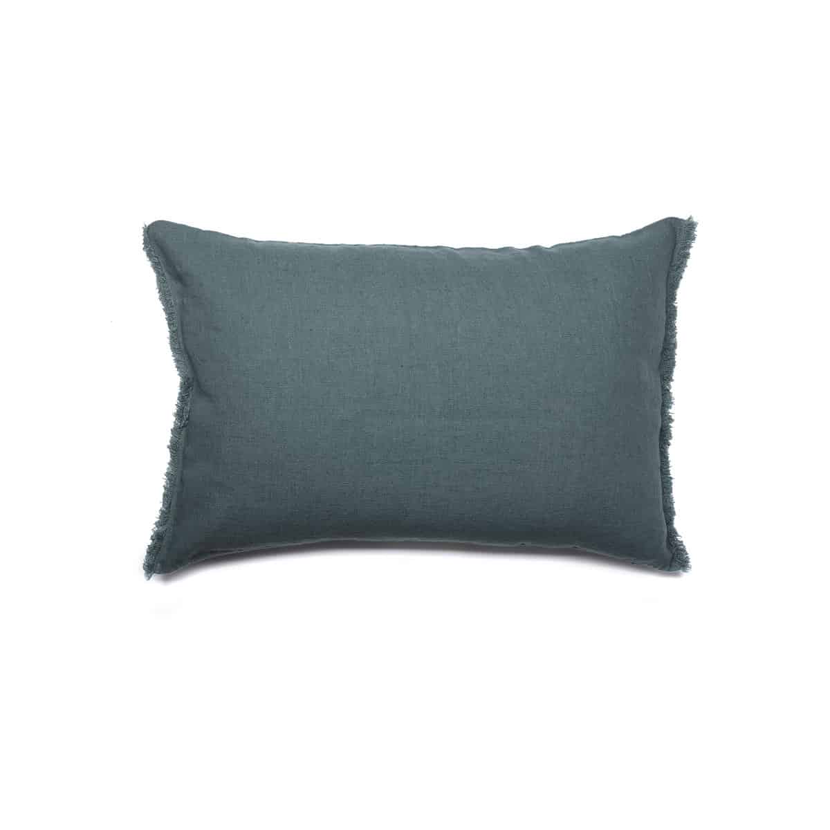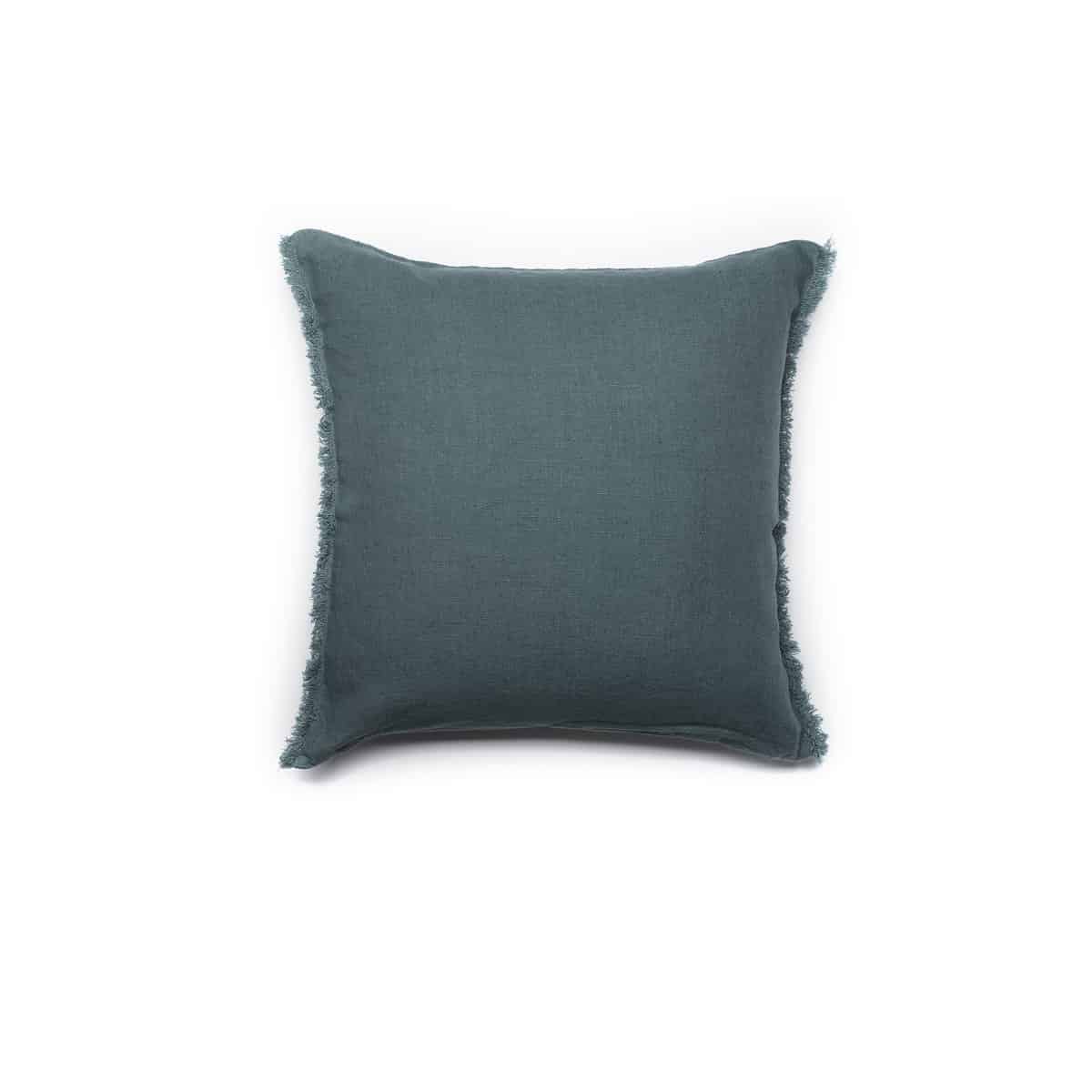 Housse de coussin Forêt 100% lin, douce et élégante, avec des franges entièrement réalisées à la main. Une couleur Forêt, un vert intense comme une forêt du grand Nord pour habiller votre intérieur d’un chic fou.