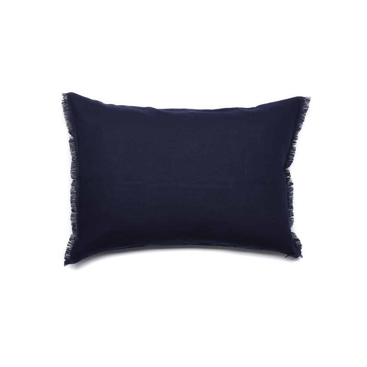 Housse de coussin Indigo, 100% lin, douce et élégante, avec des franges entièrement réalisées à la main. Une couleur Indigo, très chic et profond pour habiller vos intérieurs tout en élégance.