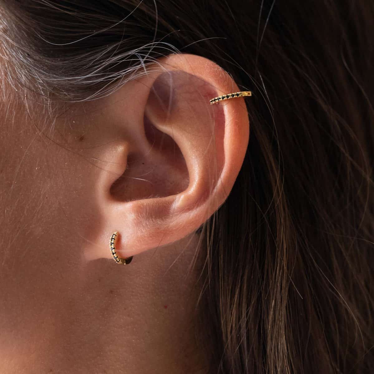 - Matériaux : laiton doré à l’or fin 18 carats à 5 microns. Zircons noirs sertis à la main.