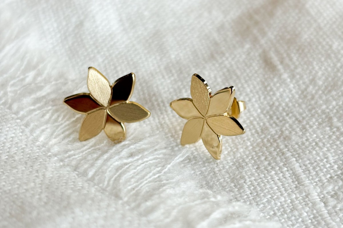 Cette collection en plaqué or 18 carats, se compose de plusieurs boucles d’oreilles de différentes tailles pour répondre à toutes vos envies ainsi qu’un bracelet orné de deux délicates fleurs à chaque extrémité.